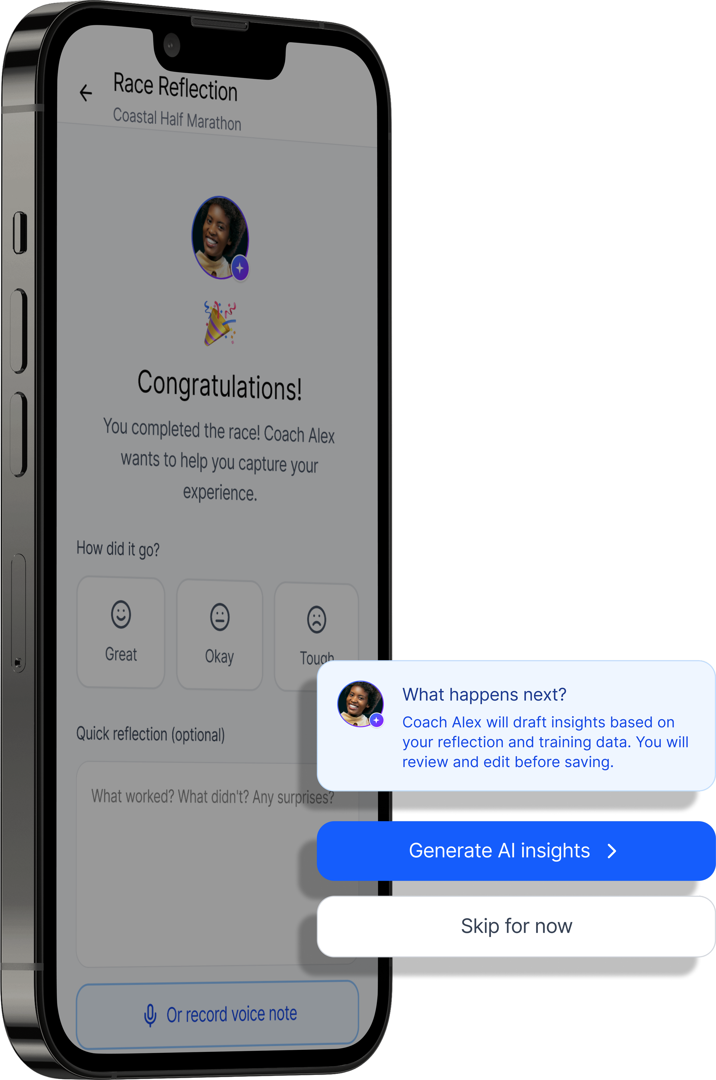 Athletes log quick post-race reflections so AXIS can merge subjective feedback with training data to generate insights and refine race guidance.