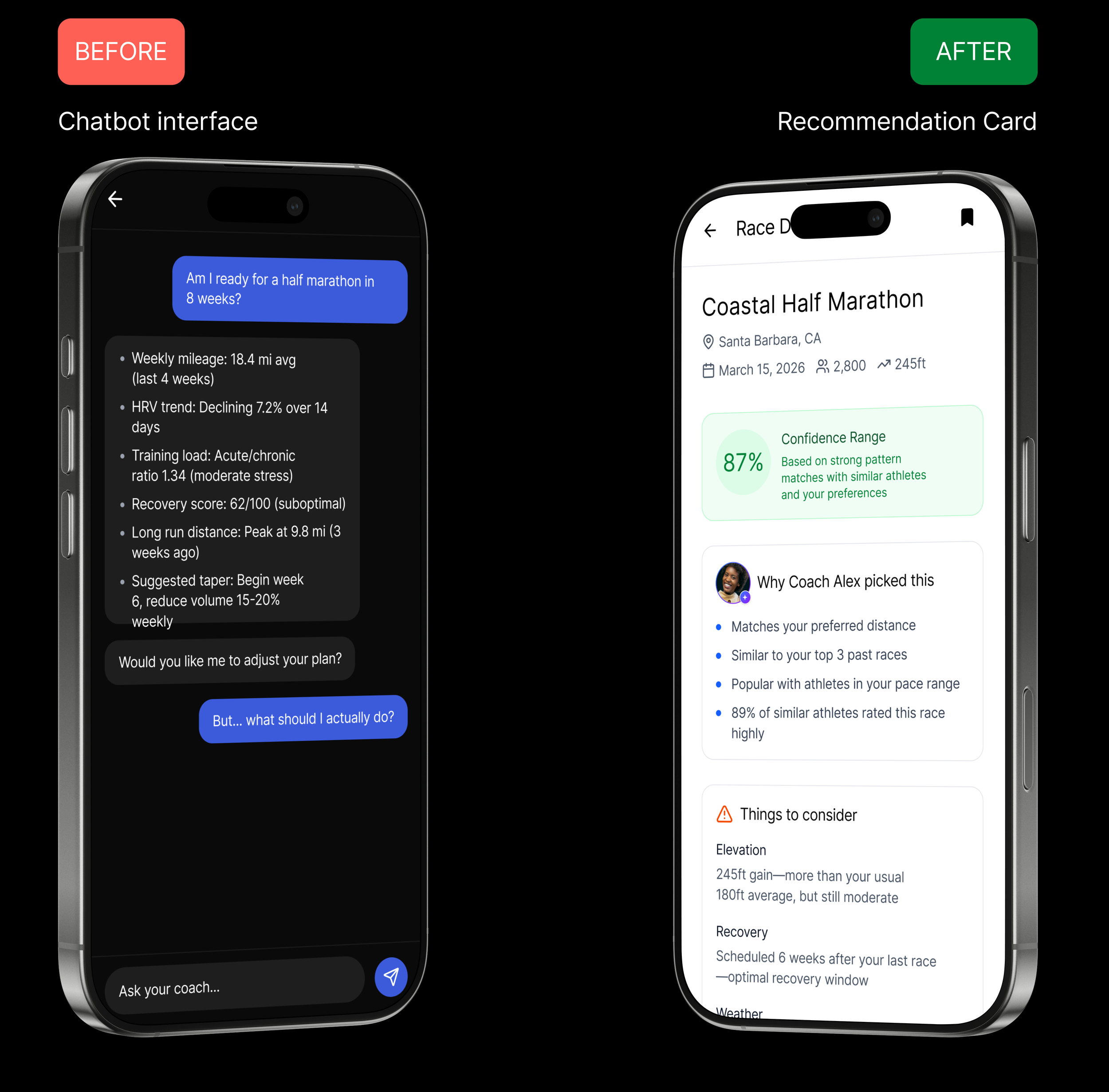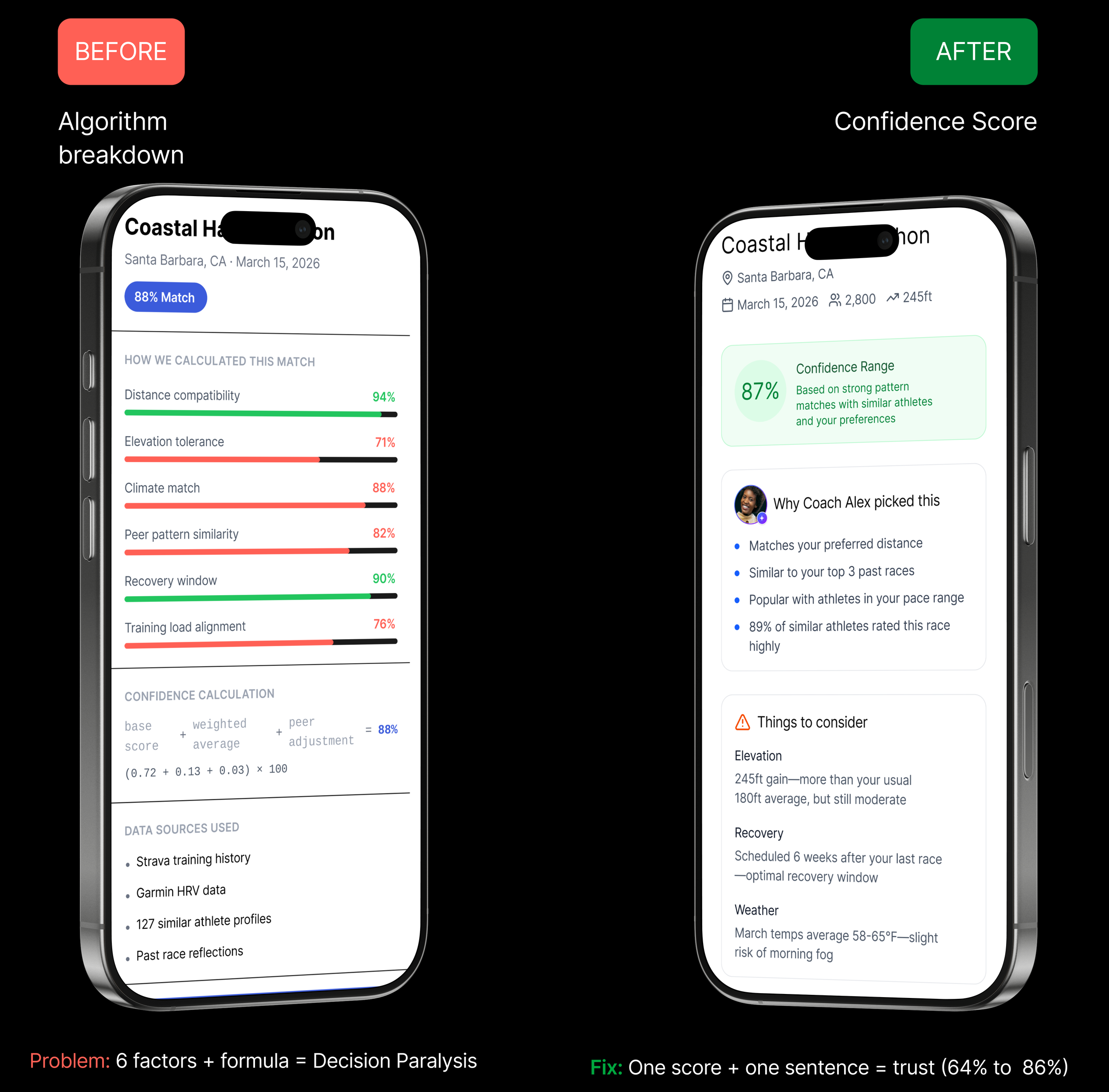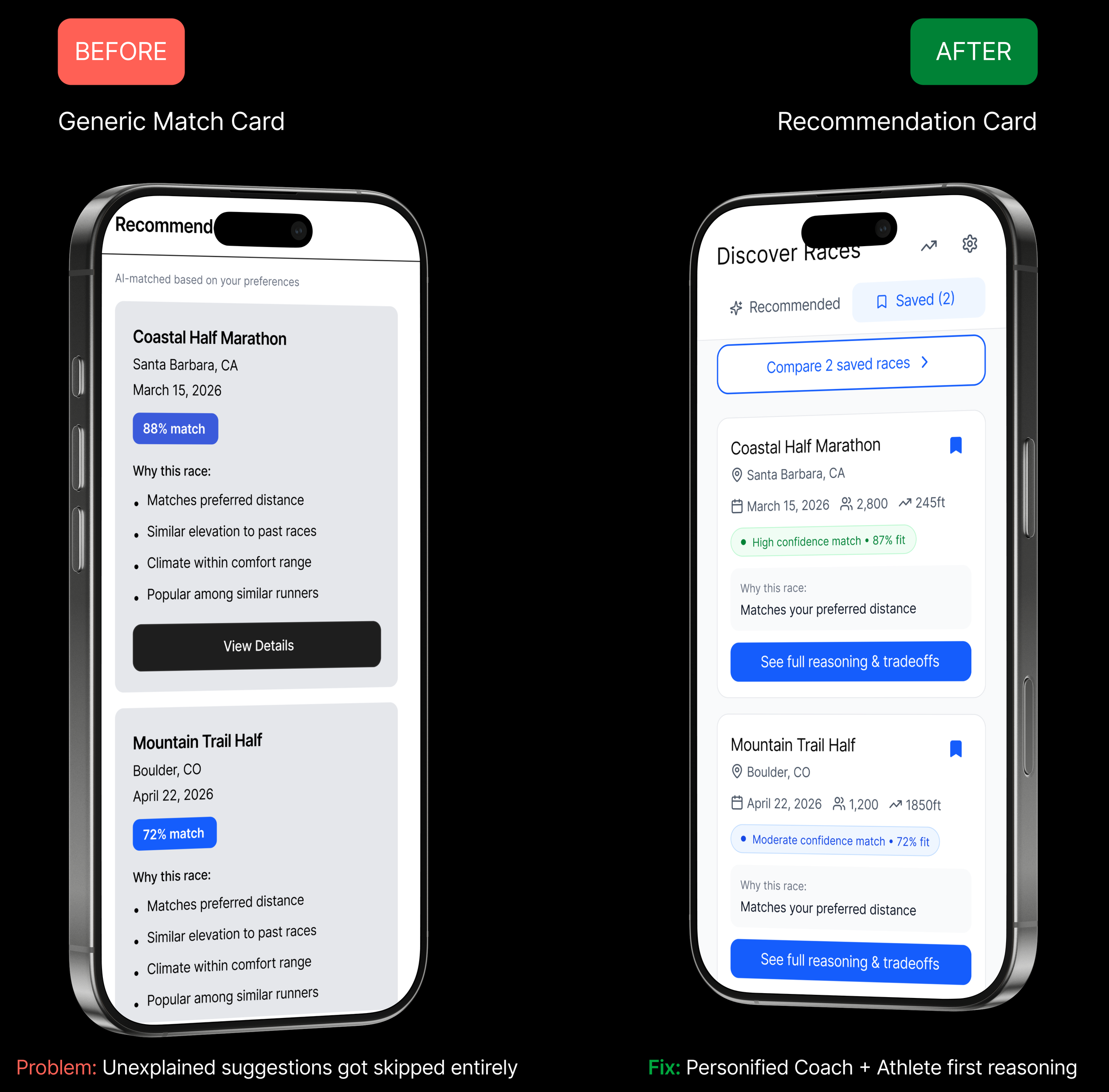 The fix: 'Why this race' rewritten to lead with the athlete's own data, not system logic.