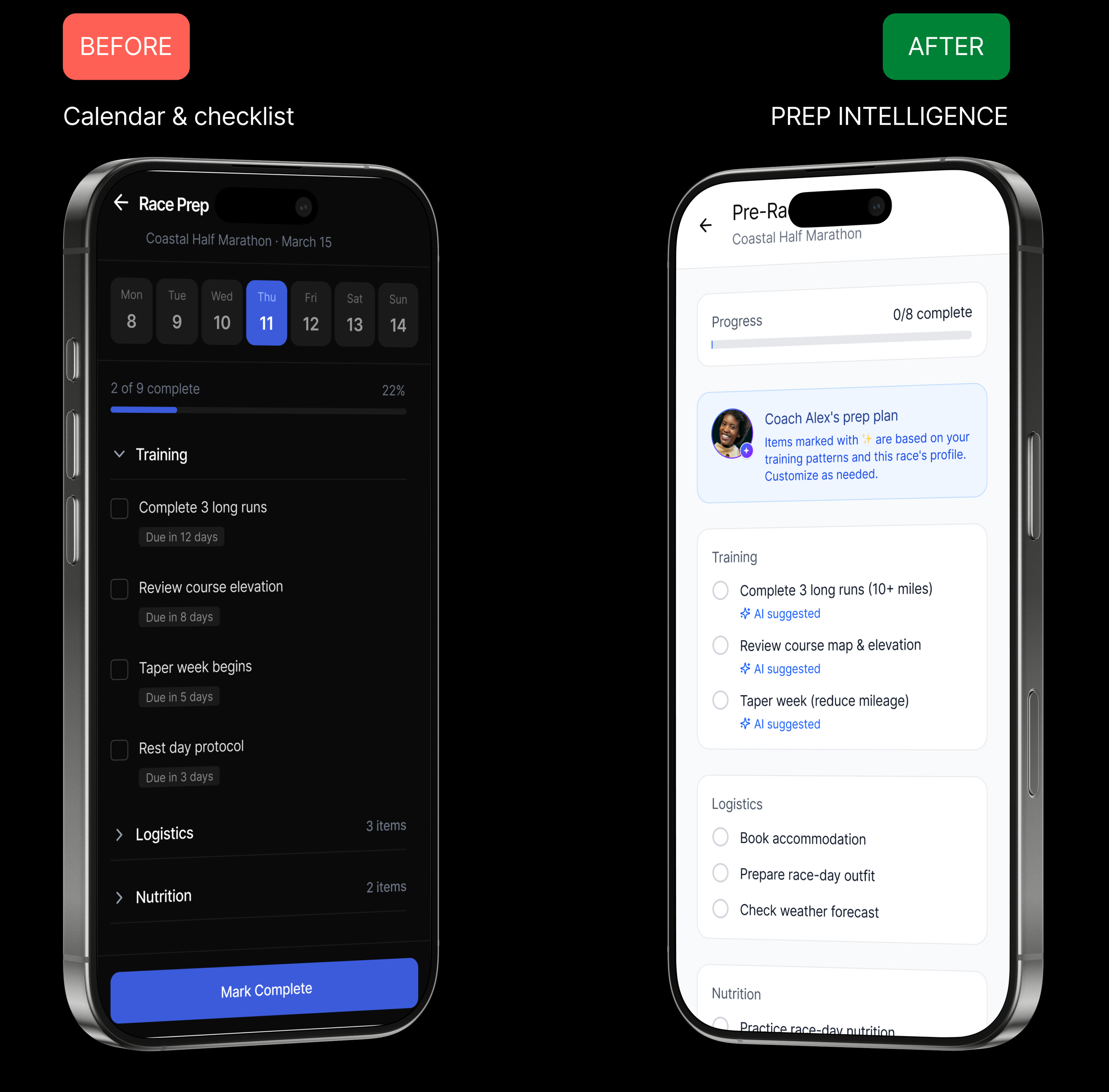 — Half marathon runner, research sessionStructured. Satisfying to complete. Totally missed the upstream problem. Athletes finished every checklist and still arrived at races unprepared for terrain and conditions.