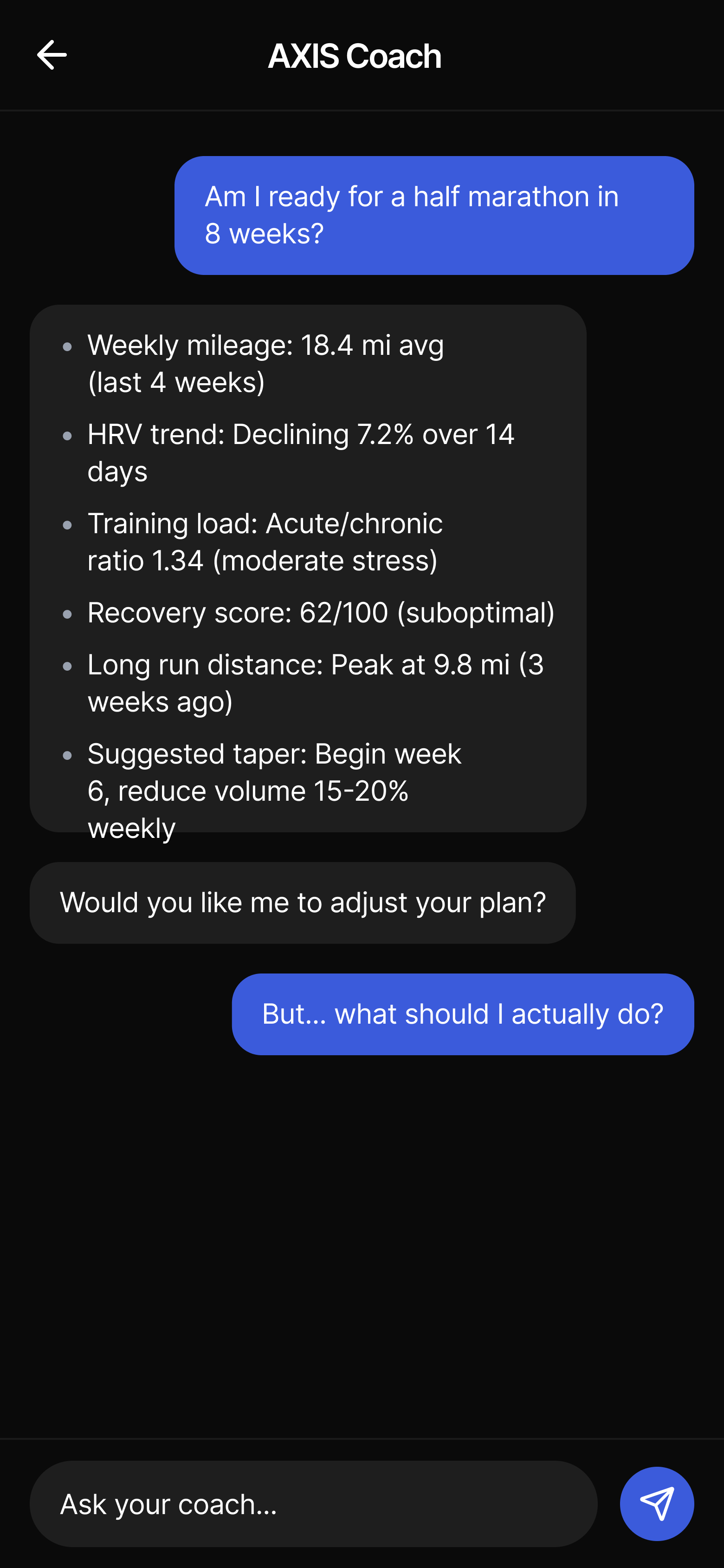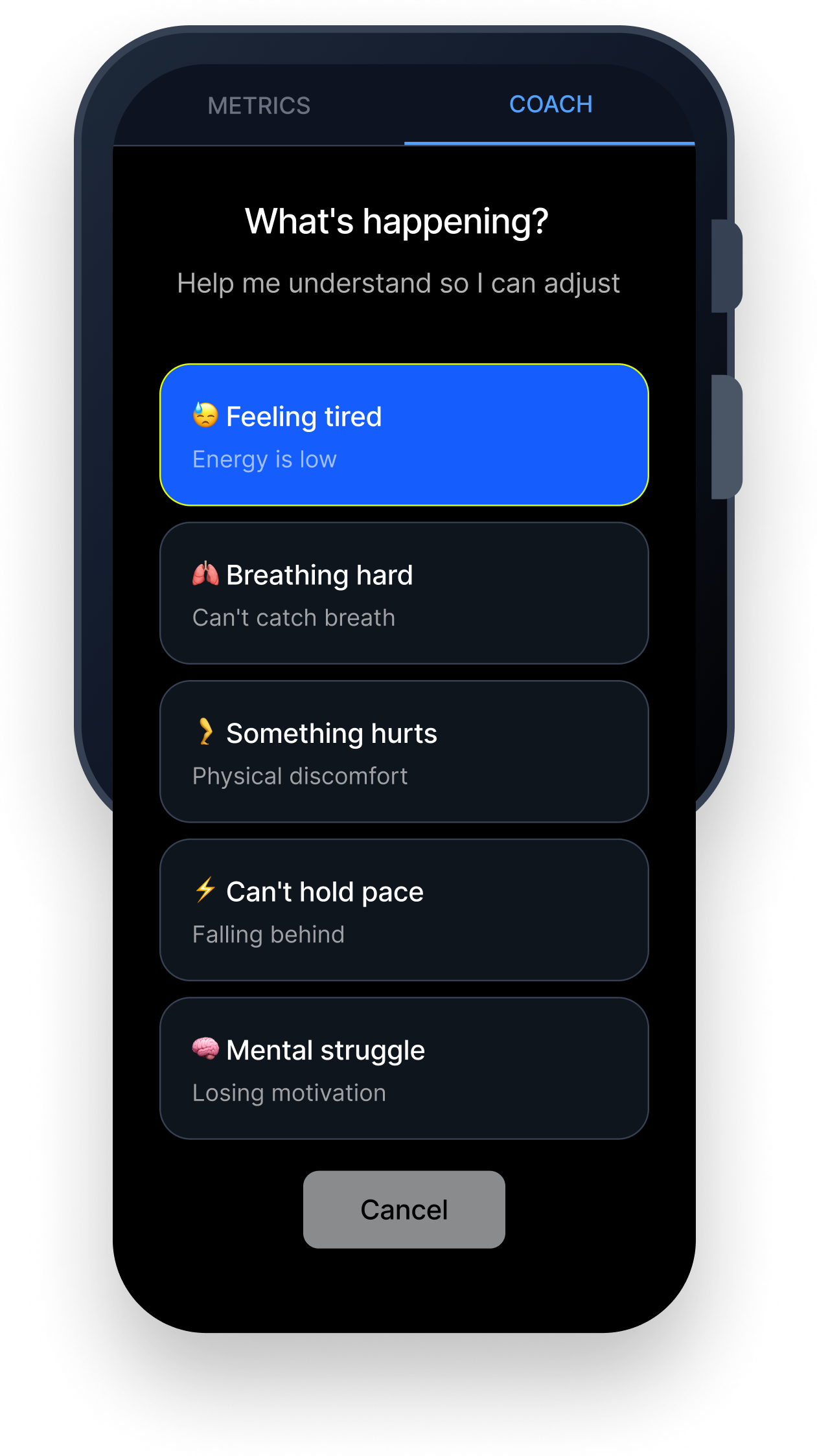 - Ultramarathon runner, research sessionAthletes could ask anything. In practice, they asked one question — then immediately asked why. The conversation loop added friction instead of removing it.
