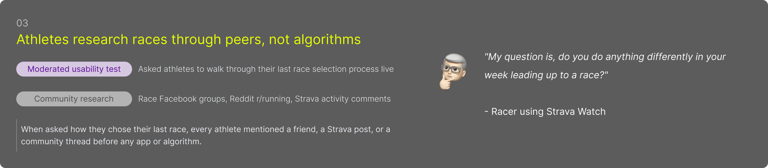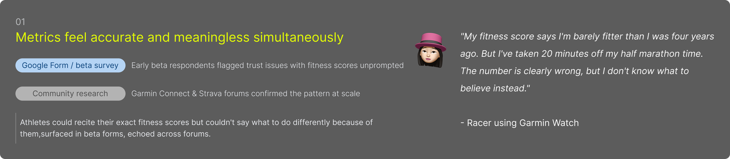 Mixed-methods research across two phases - a beta survey to surface patterns at scale, followed by moderated usability testing with 14 endurance athletes to understand the why behind them. Community research across Strava, Reddit, and Garmin forums ran throughout.