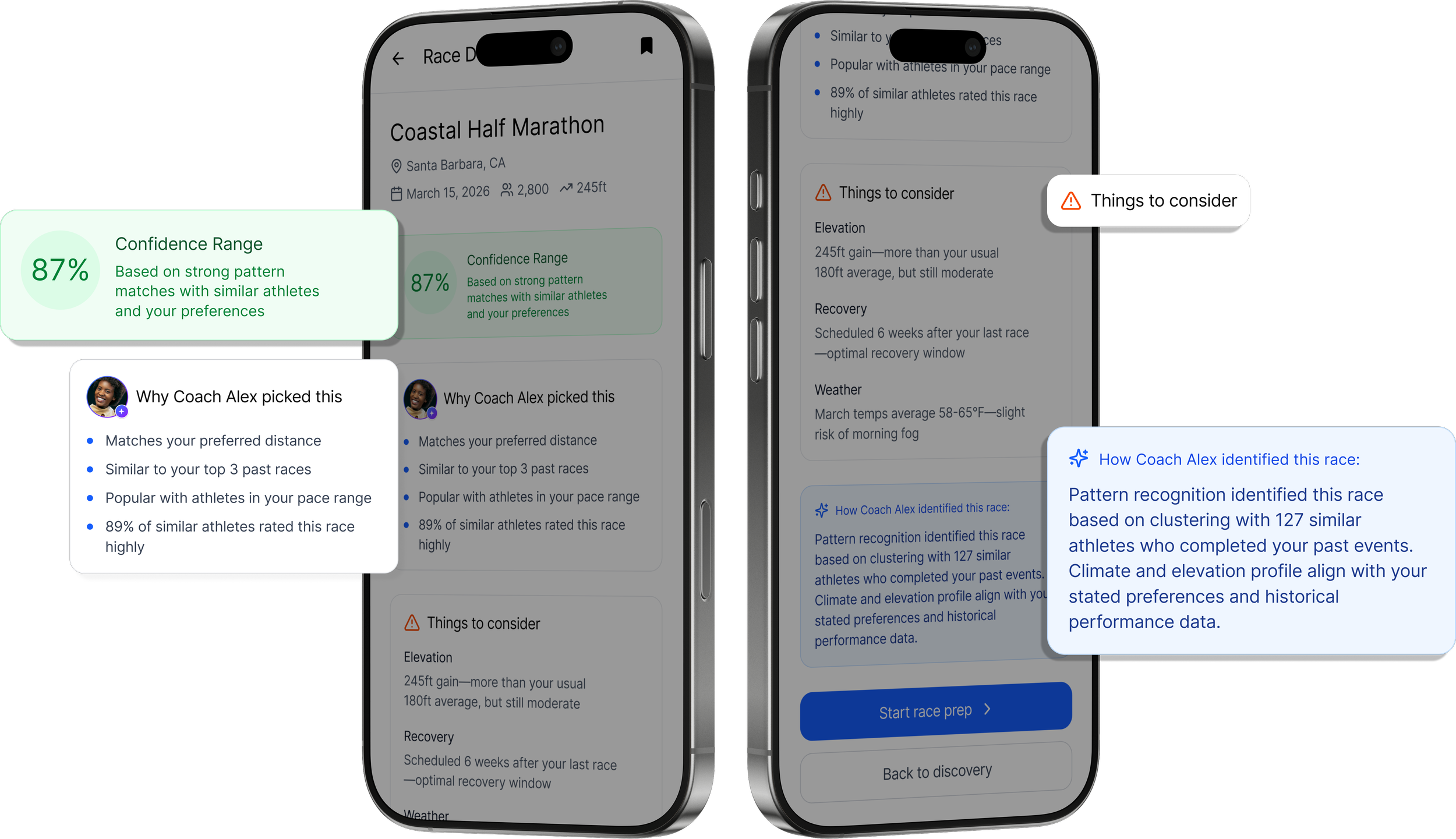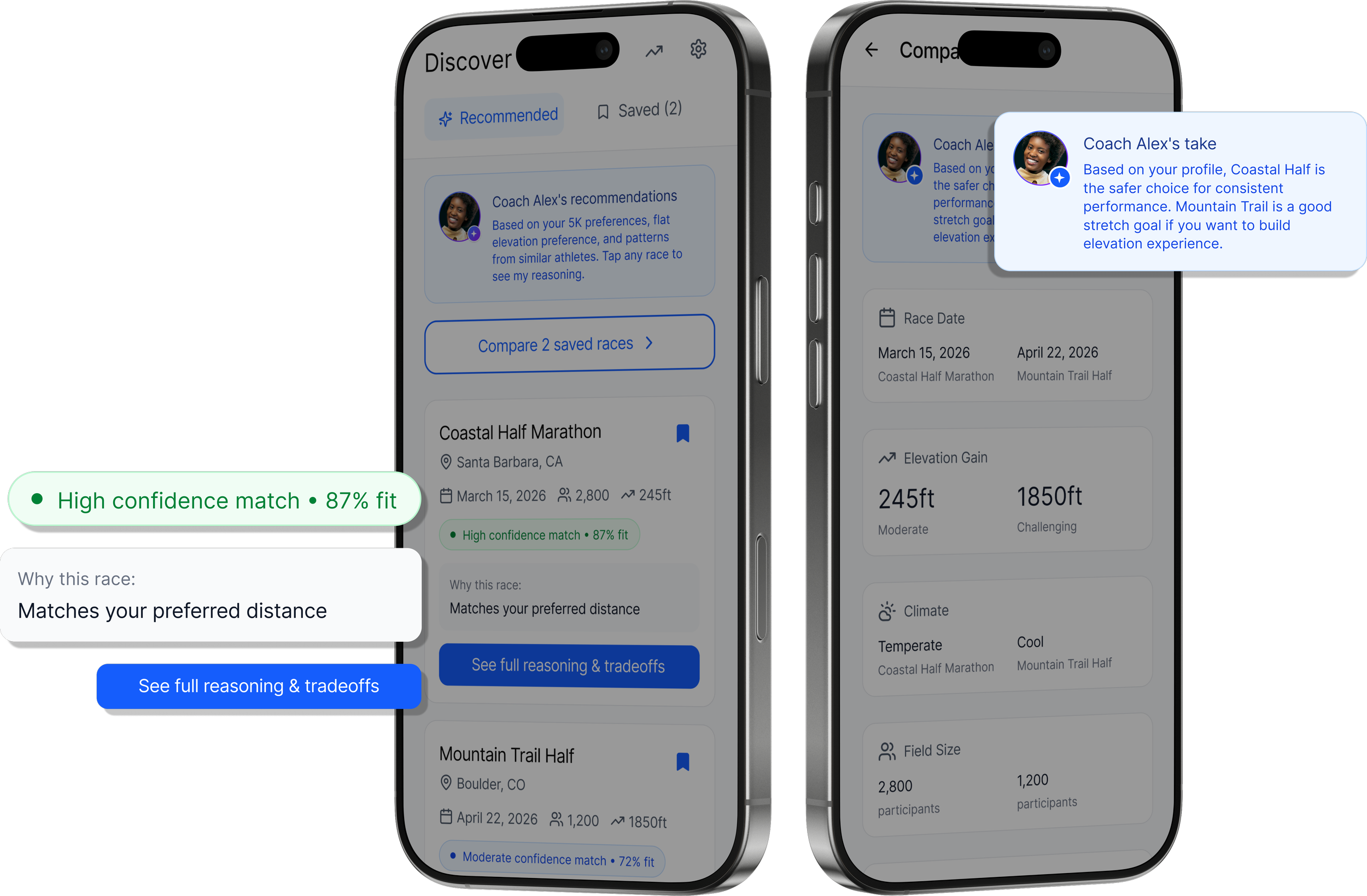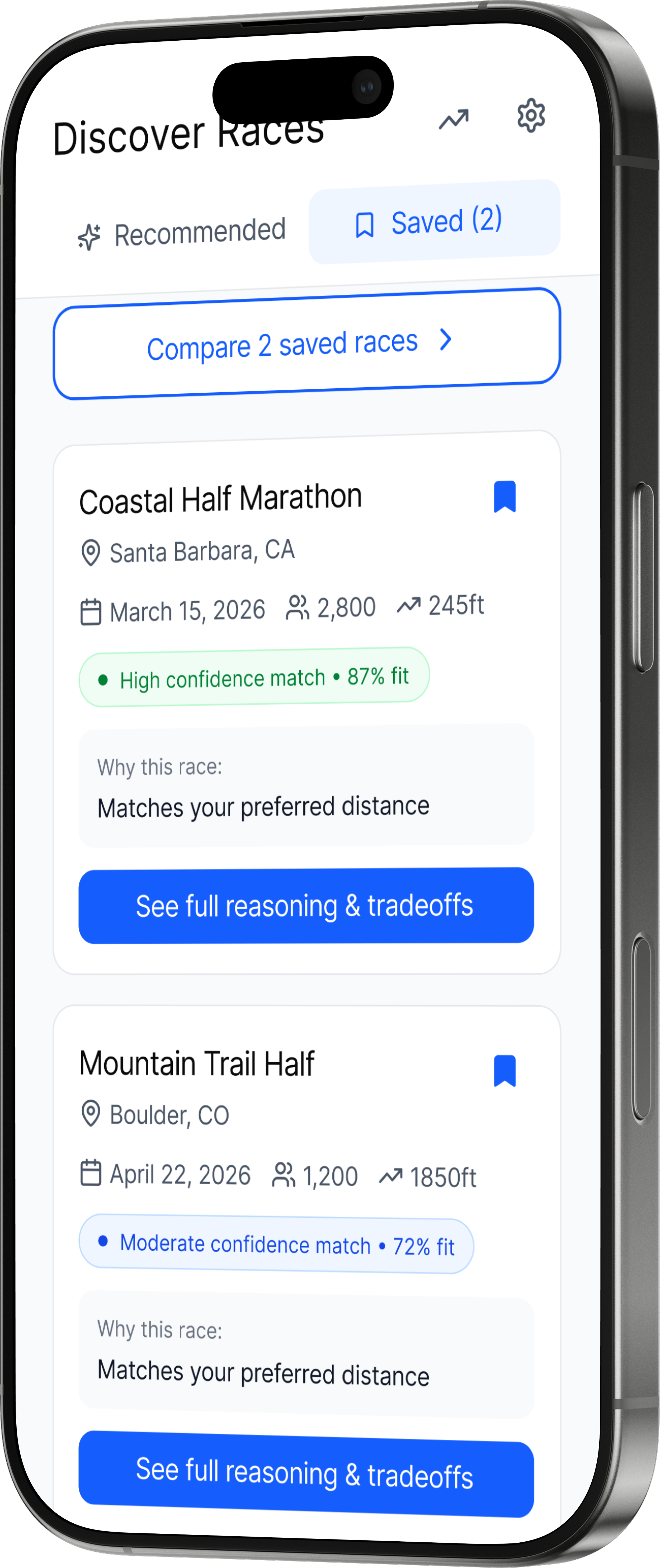 Each race is assigned a confidence score and surfaced with transparent reasoning so athletes can evaluate trade-offs before committing.