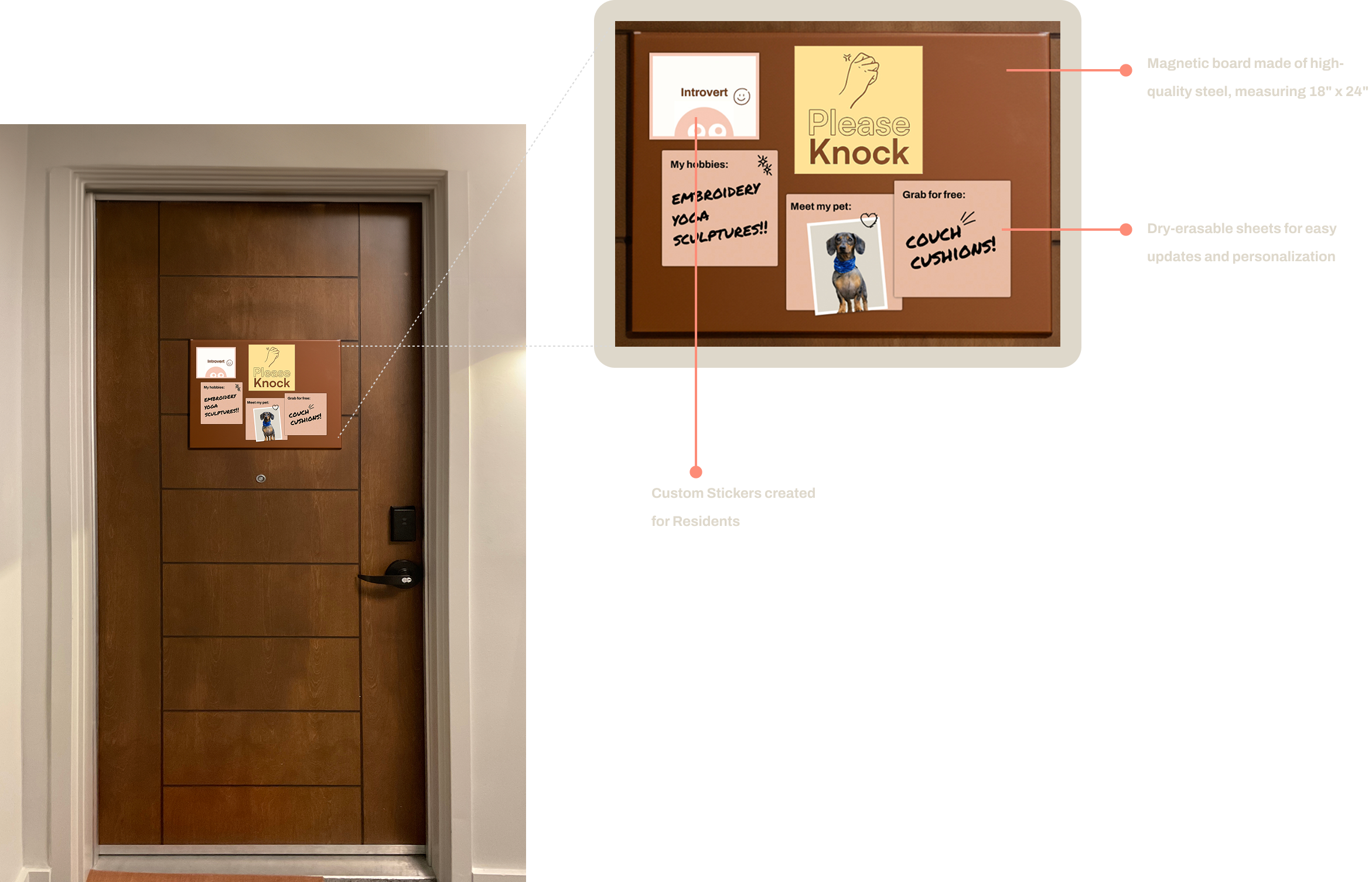 A door board provides visual cues for resident connection and communication, helpful for newcomers or introverts. It displays announcements or alerts (e.g., "HOH: Please call or switch the light on if there's no answer").