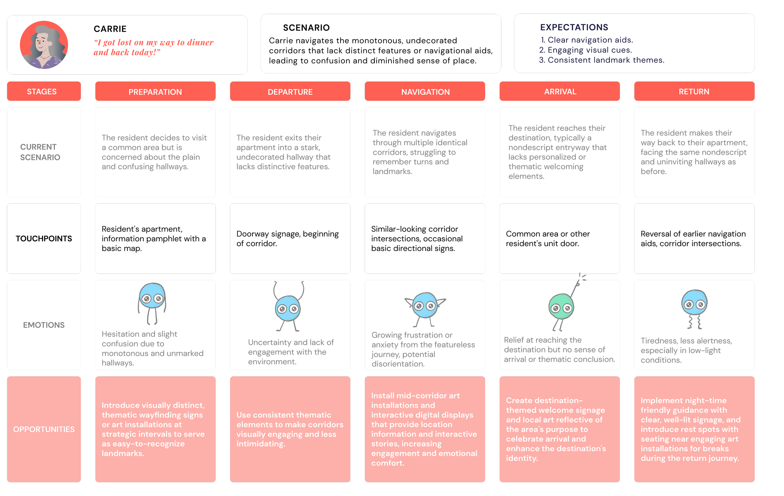 Documented residents' daily interactions to reveal navigation issues and engagement opportunities, collecting firsthand insights to guide solutions.